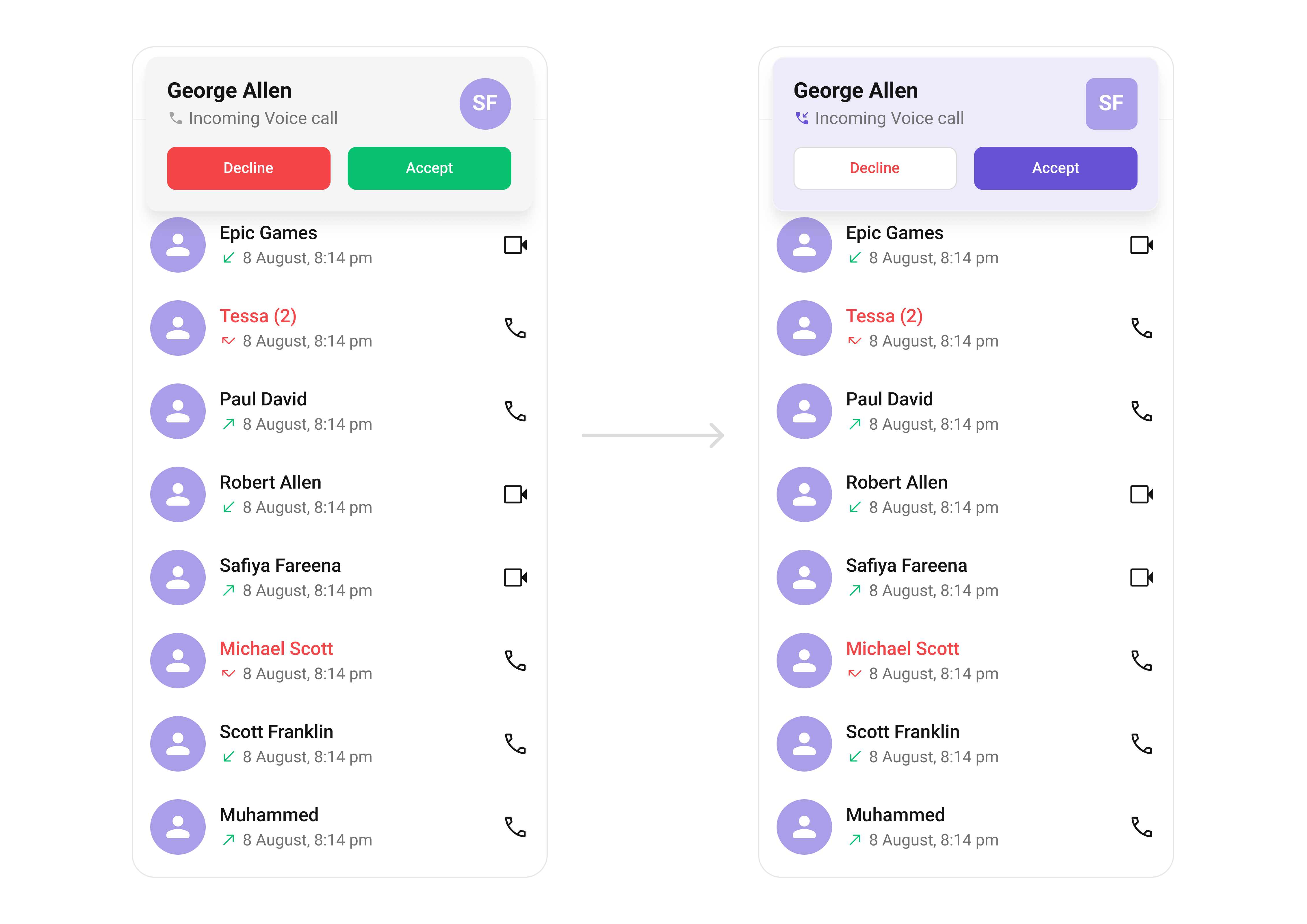 TheCometChatCallLogs Component provides a list of recent calls (voice or video), showing details like call type, duration, participants, and timestamps. Developers can style text, icons, and background elements, making it easy to match the app’s design system.