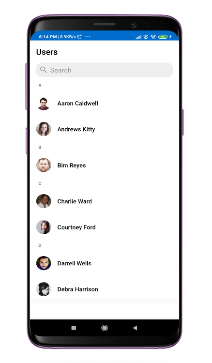 In your layout.xml add the following snippet to use the CometChatUserList. Adding the following code snippet will give you a fully working list of users.