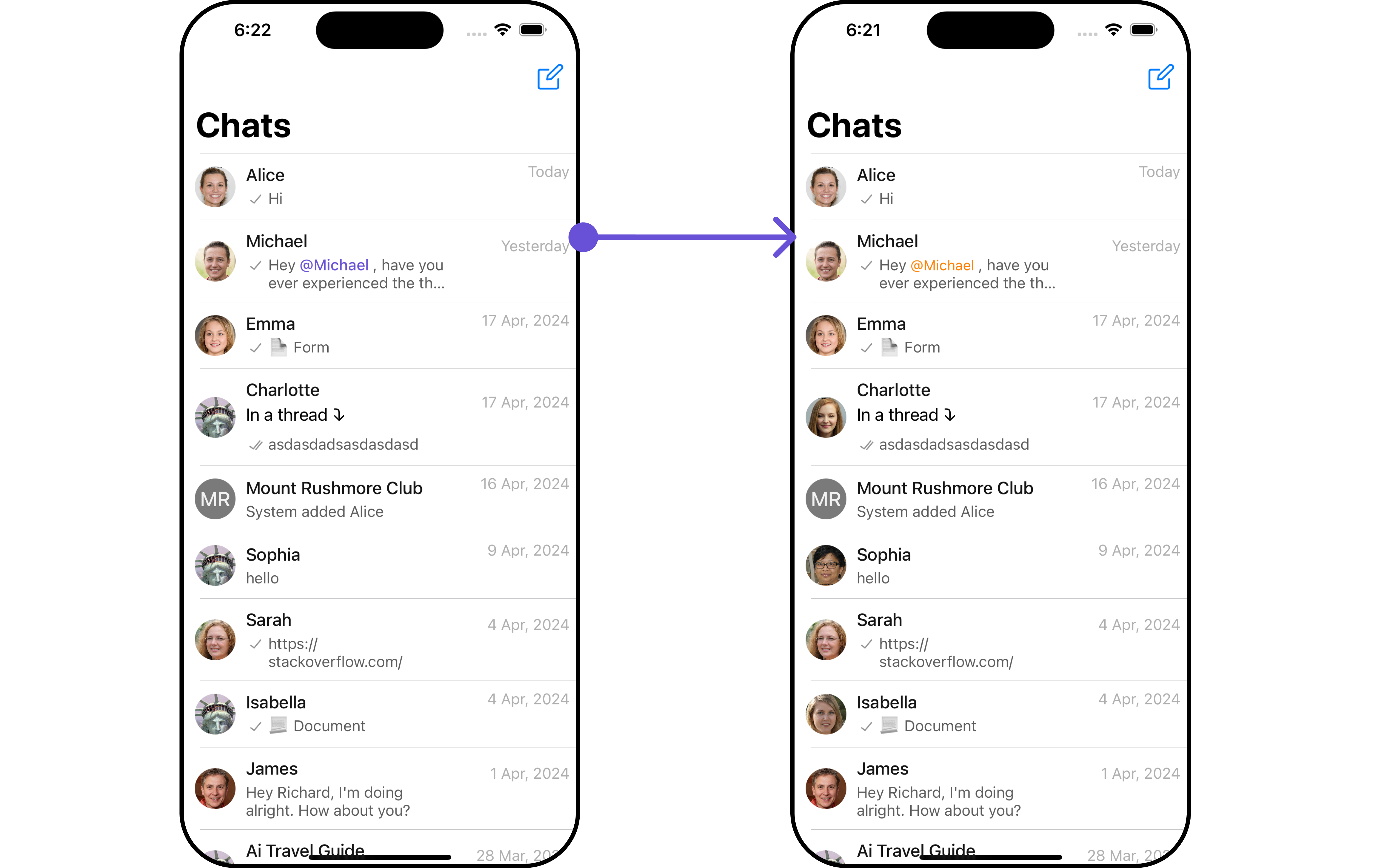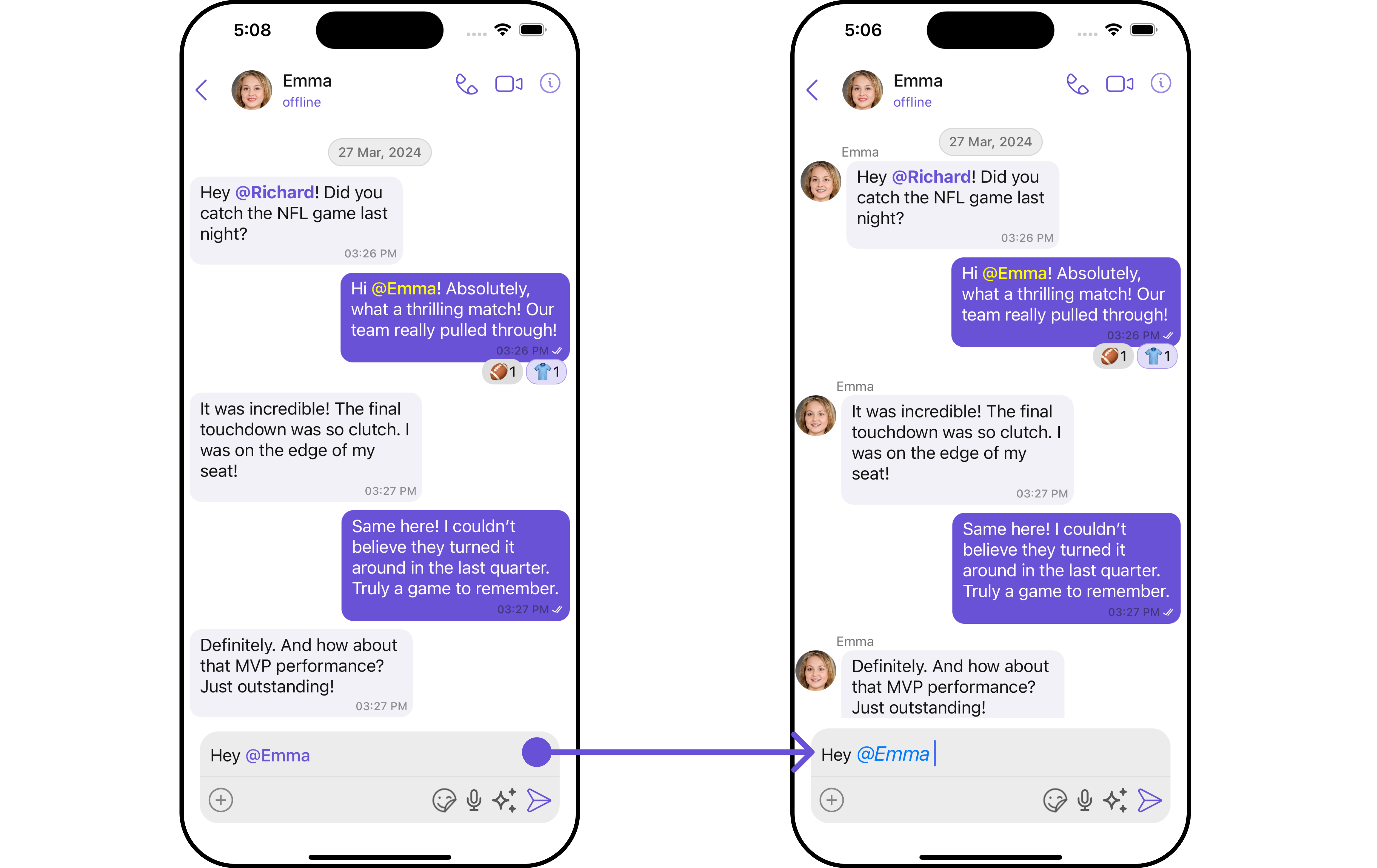 .set(leftBubbleTextStyle),.set(rightBubbleTextStyle),.set(composerTextStyle), and.set(conversationListTextStyle)methods to format text messages with mentions appropriately for display in the chat interface. - Customization: Customize the appearance and behavior of mentions by adjusting the text styles, colors, and other formatting properties as needed.