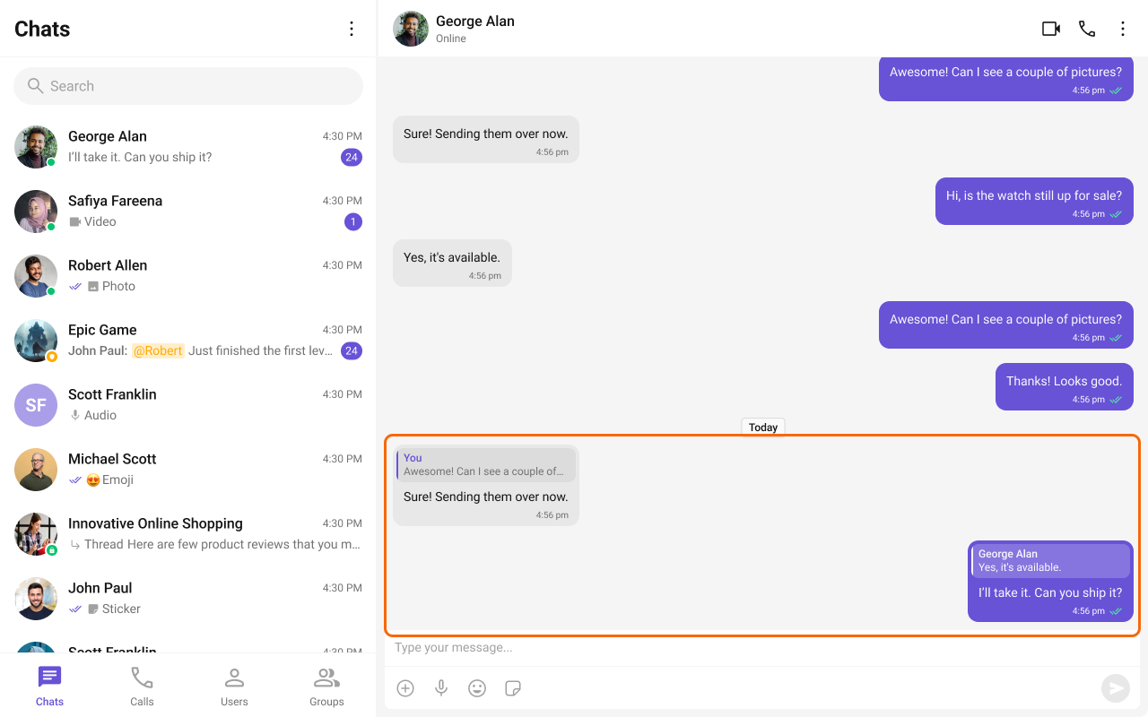 | Message Composer | Message Composer works seamlessly with Quoted Message by showing the quoted reply above the input field, letting users compose their response in proper context. |