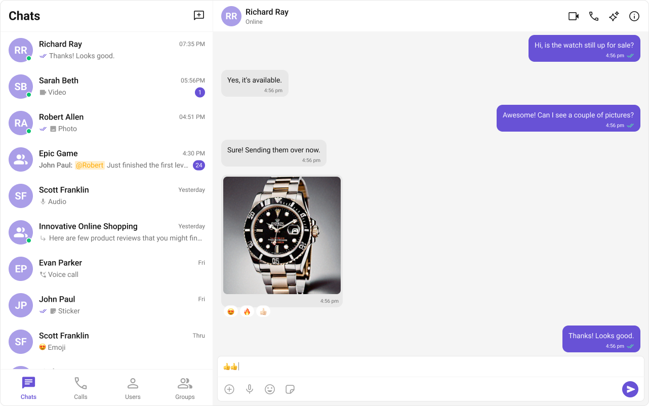 Beyond text, CometChat allows users to share various media types within their conversations. This includes images, videos, audio files, and documents, enriching the chat experience and enabling more comprehensive communication.