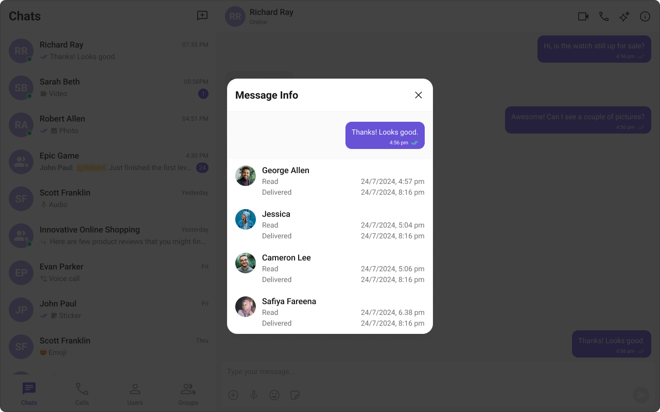 CometChat’s Read Receipts feature provides visibility into the message status, letting users know when a message has been delivered and read. This brings clarity to the communication and ensures users are informed about the status of their messages.
