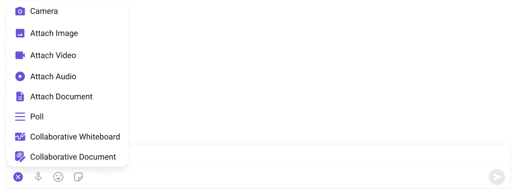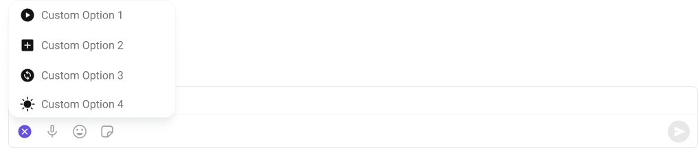 By usingattachmentOptions, you can set a list of custom MessageComposerActions for the MessageComposer Component. This will override the existing list of MessageComposerActions.